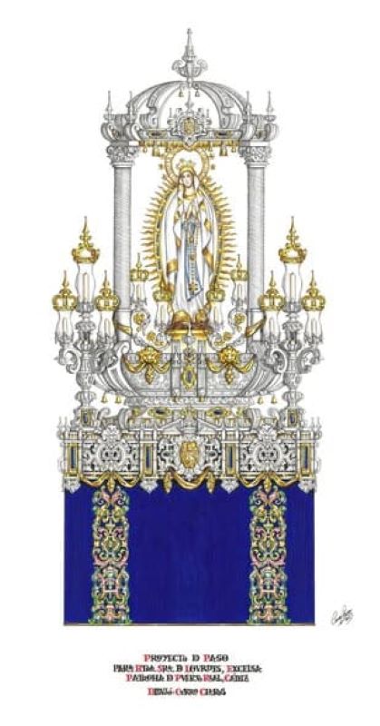 El diseñador malagueño Curro Claros ha proyectado el nuevo paso que portará a la Excelsa Patrona de Puerto Real, la Santísima Virgen de Lourdes, basado en una obra de orfebrería y bordado que busca ensalzar la figura de la Virgen, con un marcado estilo manierista, caracterizado por su riqueza ornamental y la elegancia de sus líneas arquitectónicas.