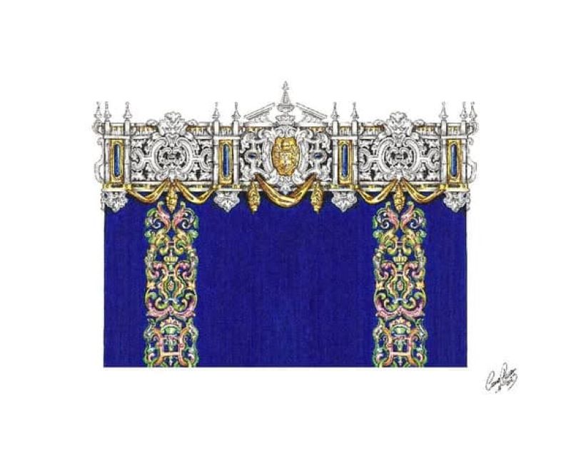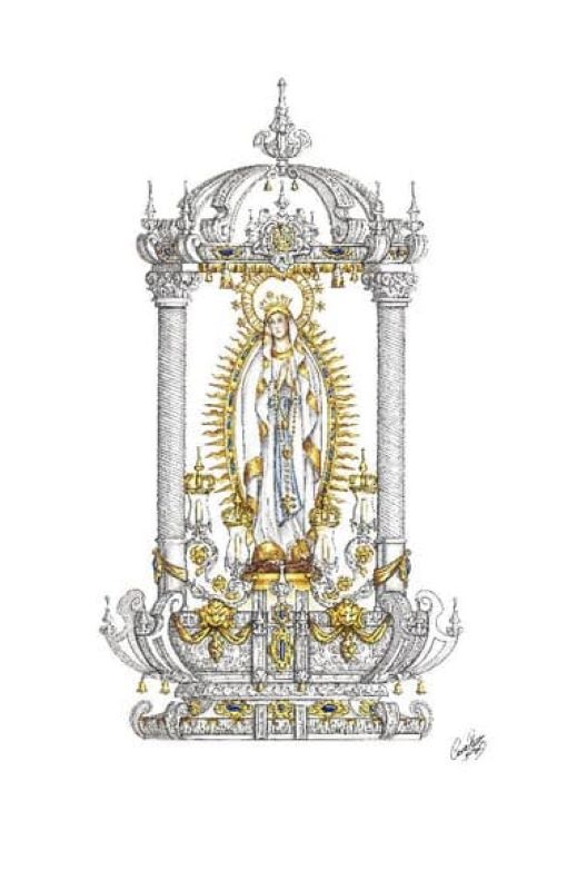 Cuenta con acentos cromáticos y luminosos ya que la orfebrería plateada y dorada se enriquece con aplicaciones de esmaltes en azul cobalto, que aportan vibrantes toques de color y profundidad al conjunto. Además, el paso se ilumina en sus esquinas por cuatro majestuosos candelabros, cada uno de ellos con cuatro brazos de luz, dispuestos para crear un aura luminosa alrededor de la Titular.