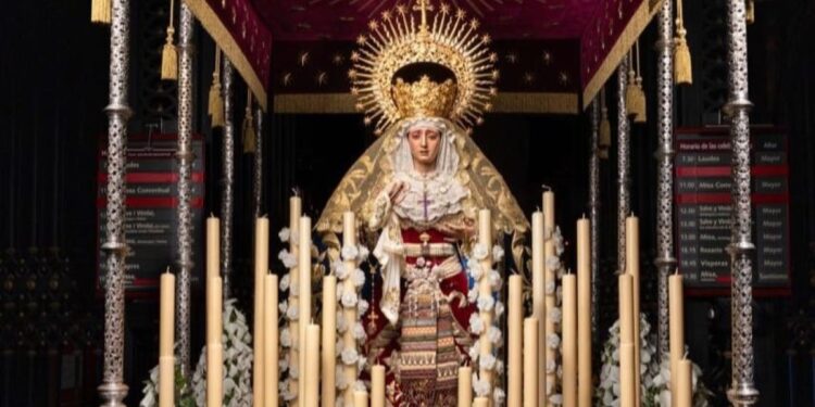 La dolorosa del Viernes Santo recorrió los alrededores del Monasterio en un rosario histórico, portada por cofrades sevillanos y catalanes, y presidió una emotiva misa de acción de gracias oficiada por el arzobispo de Sevilla, José Ángel Saiz Meneses, a la que también asistió el Presidente de la Junta de Andalucía Juanma Moreno; en un encuentro único junto a La Moreneta.