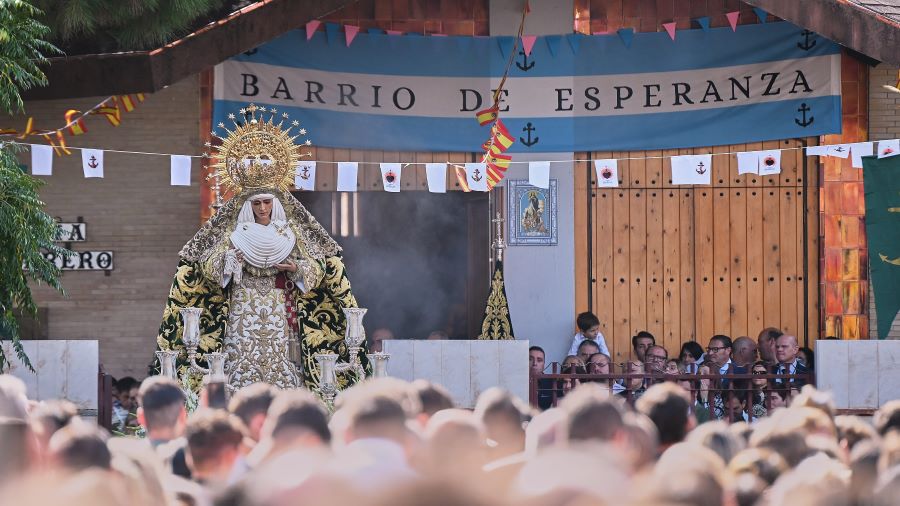 El 12 de octubre, día de la Fiesta Nacional de España y de la patrona de la Hispanidad, la Virgen del Pilar; la Esperanza de Triana continuó con la Misión organizada con motivo del Año Jubilar de la Esperanza por el Polígono Sur, con su traslado desde la parroquia de Pío X en el barrio de Las Letanías, hasta la de Jesús Obrero, donde la casa Bendición y Esperanza, regentada por los salesianos, lleva a cabo una labor encomiable en esa zona tan deprimida de Sevilla.