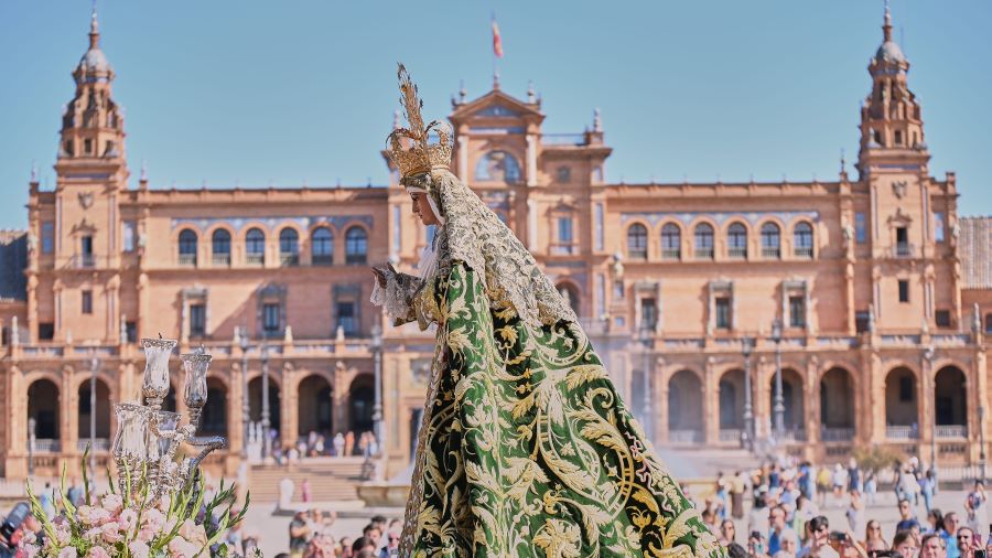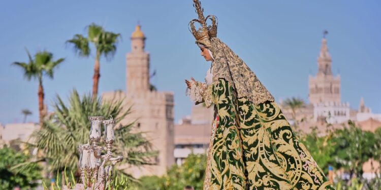 Nuestra Señora de la Esperanza se encuentra ya sobre las andas de traslado a San Jacinto. Para esta ocasión luce el nuevo manto bordado sobre terciopelo verde, ejecutado en el taller de Pepi Maya, siguiendo el diseño de Francisco Javier Sánchez de los Reyes. Viste la saya inspirada en la donada por el torero Juan Belmonte en 1937, realizada en oro fino en el taller de los sucesores de Esperanza Elena Caro en 2018 y como toca de sobremanto porta la reproducción de la histórica toca de volantes, confeccionada en 2024 por Alfonso Aguilar. El rostrillo está elaborado con un tocado de tul de plumeti enmarcado por encaje dorado francés, rematado con agremanes y conchas doradas a manera de volante fruncido y porta un pañuelo de encaje de Bruselas de punto de aguja, regalo de la hermandad del Baratillo.