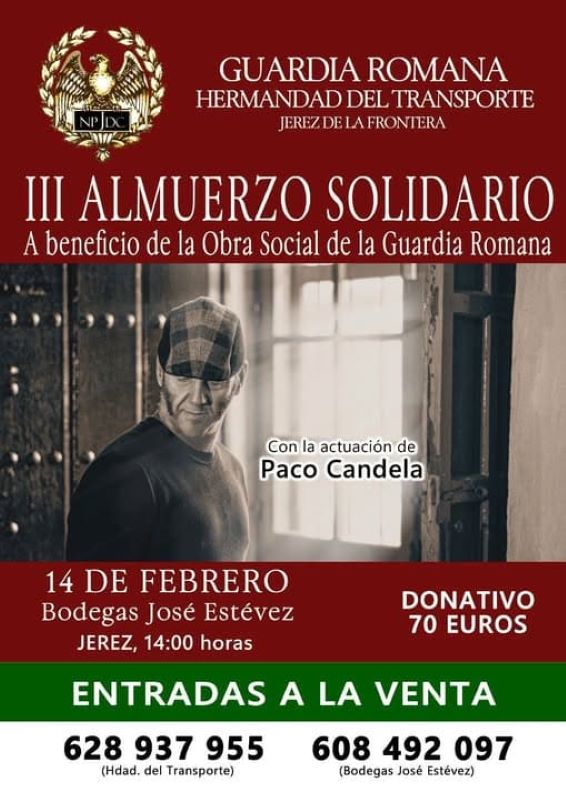 La Guardia Romana de Nuestro Padre Jesús del Consuelo organiza el sábado 14 de febrero, a partir de las 14:00 horas en la Bodega José Estévez de Jerez, un almuerzo-gala cuyos beneficios irán destinados a su Obra Social.