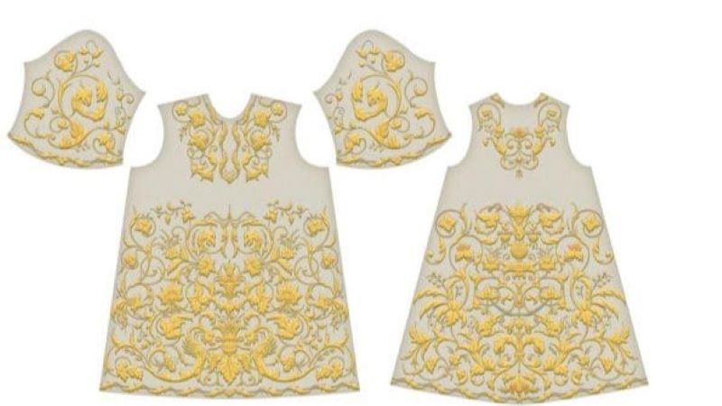 La túnica presentaba una hermosa composición simétrica, predominantemente vegetal, que incluía elementos del repertorio renacentista como dragones y jarras, junto a otros propios del Art Nouveau, como las sinuosas lazadas o los racimos de frutas. Gracias al material gráfico proporcionado por la hermandad, ha sido posible recuperar el diseño de la parte frontal y lateral casi al completo. Para la parte trasera, de la que no existen fotografías, ha sido necesario aplicar cierta creatividad, siempre con la intención de lograr un resultado armónico con el conjunto. La recuperación del diseño ha corrido a cargo de Antonio Castro del Pozo.