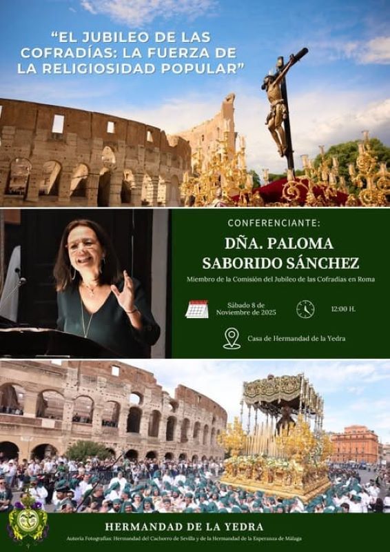 El sábado 8, a partir de las 12:00 horas en la casa de hermandad, sita en la calle Sol, Paloma Saborido Sánchez, quien fuera miembro de la Comisión del Jubileo de las Cofradías en Roma, ofrece la conferencia titulada «El Jubileo de las Cofradías: la fuerza de la religiosidad popular», que en este caso está organizada por la Diputación de Formación de la Hermandad.