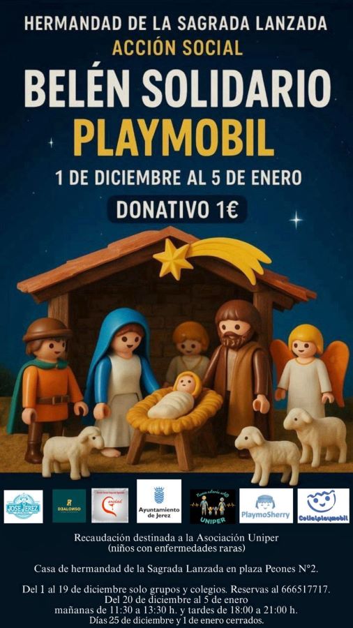 La visita tendrá una entrada-donativo de 1 euro y la recaudación íntegra irá destinada a la Asociación Uniper, dedicada a niños con enfermedades raras. A través de un comunicado la hermandad quiere mostrar su agradecimiento a las empresas y entidades colaboradoras, que han sido el Ayuntamiento de Jerez, la Asociación Uniper, el Restaurante Dealonso, Playmosherry, Jose Jerez Playmobil y Celilplaymobil.