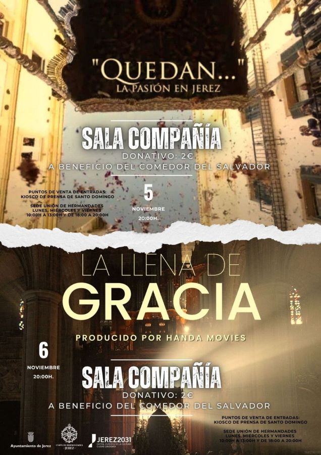 La Unión de Hermandades de Jerez proyectará  en la Sala Compañía, los días 5 y 6 de noviembre, los dos últimos documentales estrenados sobre temática cofrade en Jerez, en ambos casos con el doble objetivo de seguir dando a conocer estas dos producciones, así como el de reunir fondos que contribuyan a paliar las necesidades del Comedor del Salvador.