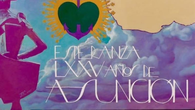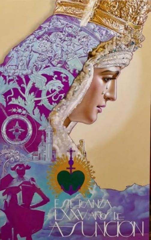 No falta la Capillita del Carmen, emblema de Triana, junto a la figura de Juan Belmonte en el Altozano, evocando el histórico traje de luces que el torero donó a la Virgen. Estos guiños conforman un mapa emocional y devocional de Triana y su historia. Sobre un cielo de nubes serenas, se inscribe el lema con tipografía de José Manuel Peña, “Esperanza, 75 años de Asunción”, acompañado por el corazón coronado sostenido por el ancla, emblema de la misión y la firme fe de la Esperanza, que asciende, simbólicamente, “al cielo”, como reza el título. No en vano, la hermandad fue impulsora en Sevilla de los actos, que hace 75 años, finalizaron con el reconocimiento por parte del papa Pío XII, que la Asunción de la Virgen a los cielos, fuera un Dogma de Fe.