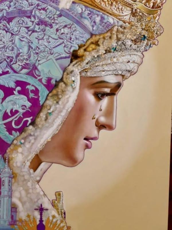 La obra presenta el rotundo y sereno perfil de Nuestra Señora de la Esperanza de Triana, que emerge majestuosa sobre un fondo beige luminoso, símbolo de pureza y trascendencia. Su silueta, reconocible y venerada, sirve de eje compositivo para acoger una serie de elementos iconográficos que evocan al propio barrio, a Sevilla y sobre todo a la devoción mariana que une a las dos orillas del Guadalquivir.
