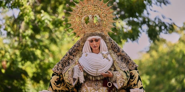 El artista entreteje referencias simbólicas y patrimoniales, como el tímpano de la puerta de la Asunción de la Catedral de Sevilla, las trazas de Sánchez de los Reyes en el nuevo manto verde donde el espíritu de Recio aún resuena, o el icónico salvavidas de la Esperanza, presidido por la rosa de los vientos que corona la Glorieta de los Marineros, testigo del paso de la Virgen en su Misión Evangelizadora.