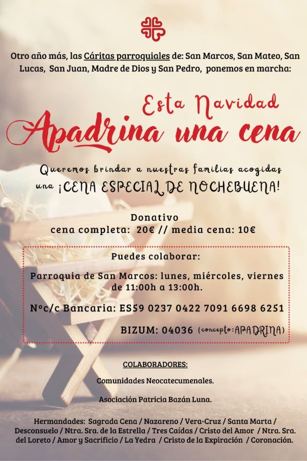 Un año más, Cáritas de las parroquias de San Marcos, San Mateo, San Lucas, San Juan, Madre de Dios y San Pedro pone en marcha la campaña Esta Navidad, apadrina una cena.